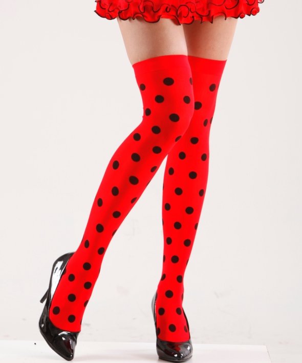 Bas coccinelle, qualité 70 deniers.Ces bas coccinelle sont, comme il se doit, rouges à pois noirs.Taille : Adulte.