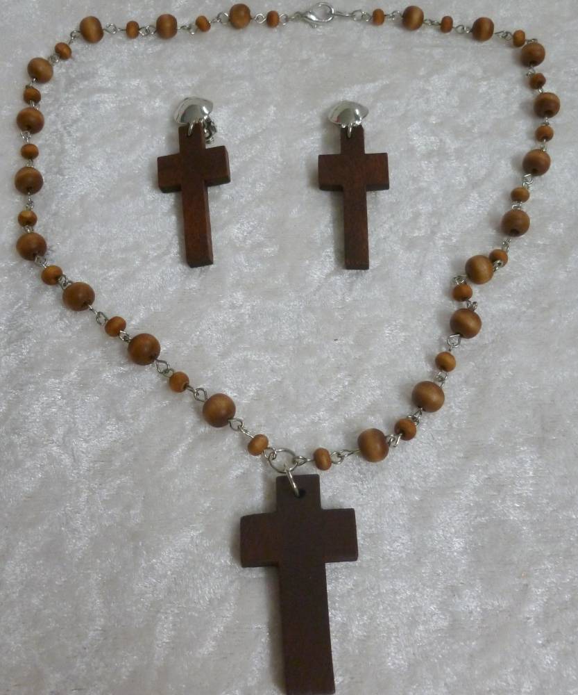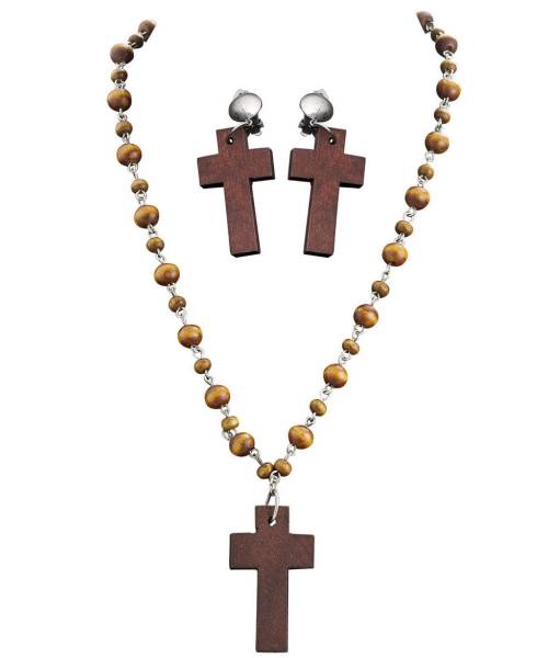 Bijoux de Bonne Soeur.Cette parure composée d'un collier de style chapelet à perles et de boucles d'oreilles à clips complétera toute tenue de religieuse.Perles et croix du collier et des boucles d'oreilles sont en bois.Accessoires de déguisement pour adulte.