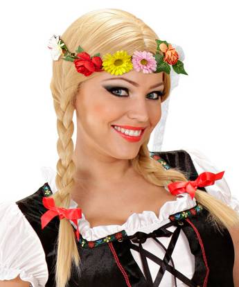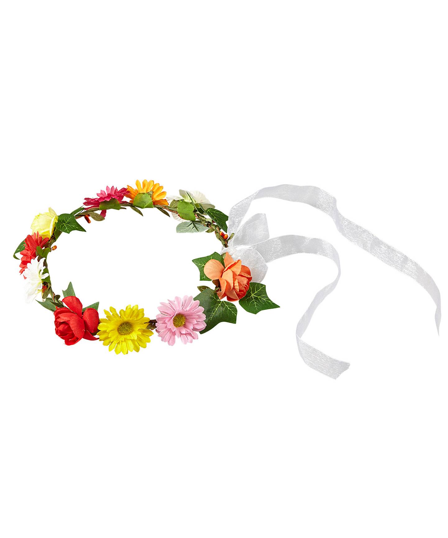 Couronne de fleurs champêtre aux couleurs vives décorée de feuilles, de roses et de marguerites.Cette coiffe fleurie peut orner toute tête de femme hippie, médiévale ou de femme bavaroise.Fleurs et pétales sont montés sur une structure en fil de fer légèrement modelable.Taille : adulte