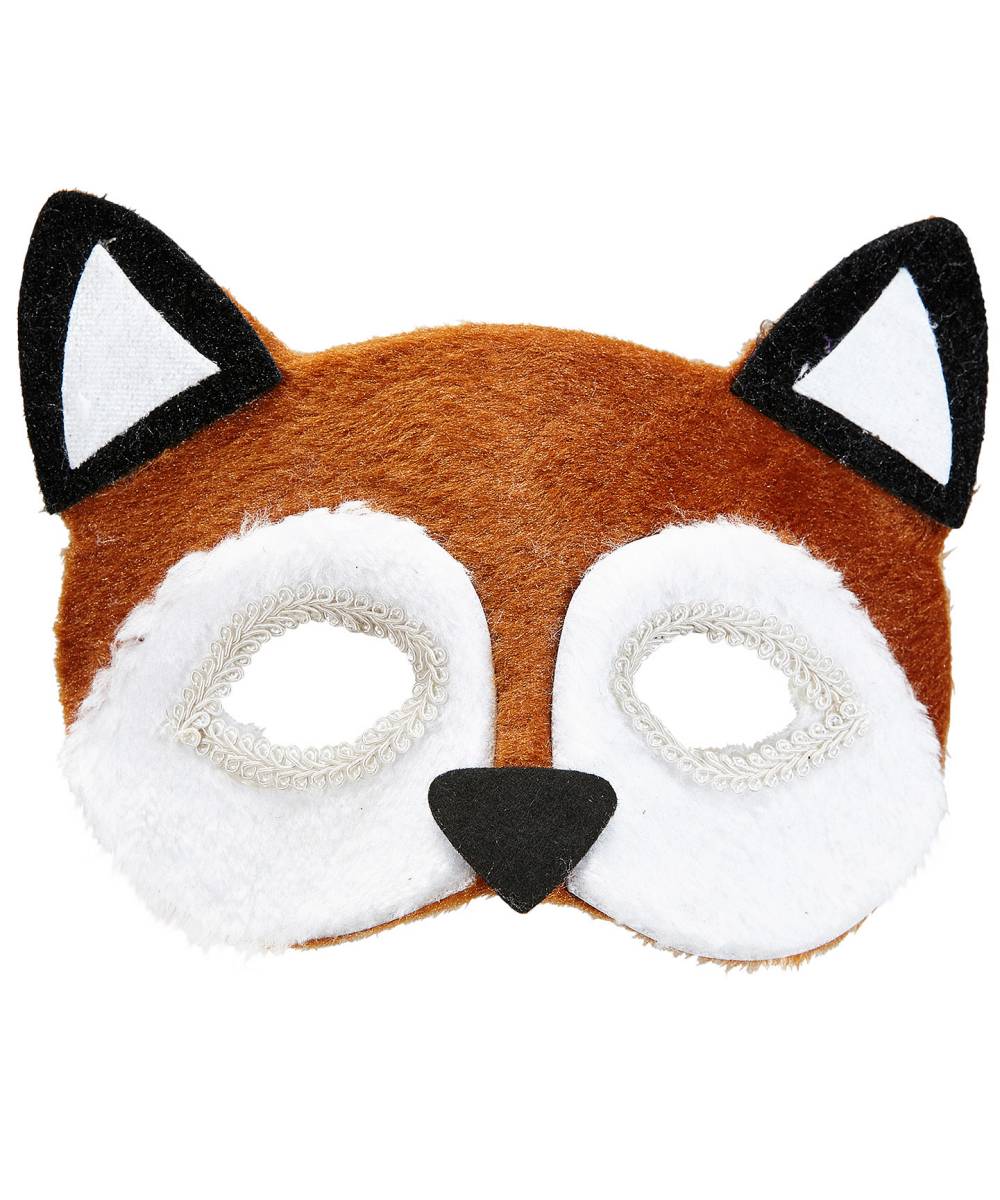 Masque de renard.C'est un masque de type 'loup' maintenu par un élastique et d'une largeur d'environ 18cm.Le contour des yeux de ce renard est muni d'un galon. Les oreilles et la truffe sont en feutrine, le reste du masque en peluche.