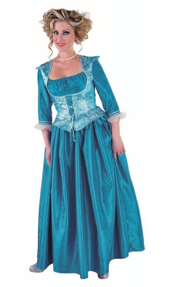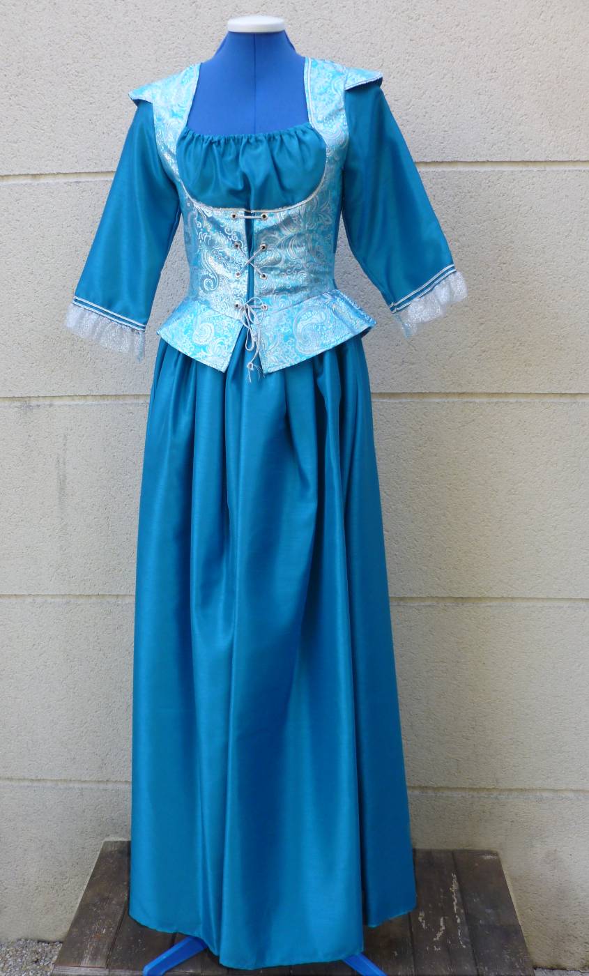 Robe de Marquise bleue pour femme. Superbe tenue en tissu épais satiné au beau tombé dans une couleur bleu turquoise.Cette robe de marquise possède un bustier attenant en brocart bleu ciel et argent, lacé à l'avant afin de resserrer le tour de taille. Fermeture de la robe au dos par un zip.Deux bandes de satin sont à nouer au dos pour permette d'ajuster la taille. La bonne couleur de bleu est sur les photos avec le faux mannequin.C'est une magnifique robe de Marquise de belle qualité, tissu au beau tombé.Matière 100% Polyester / Taffetas / Brocart