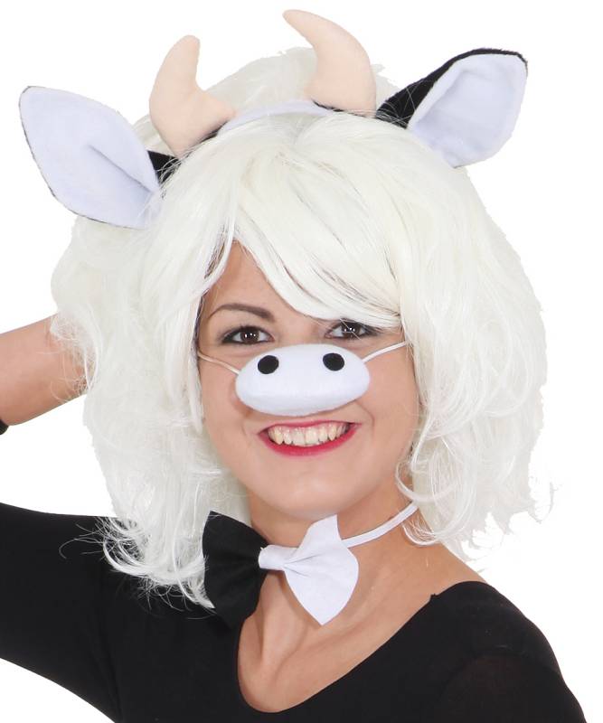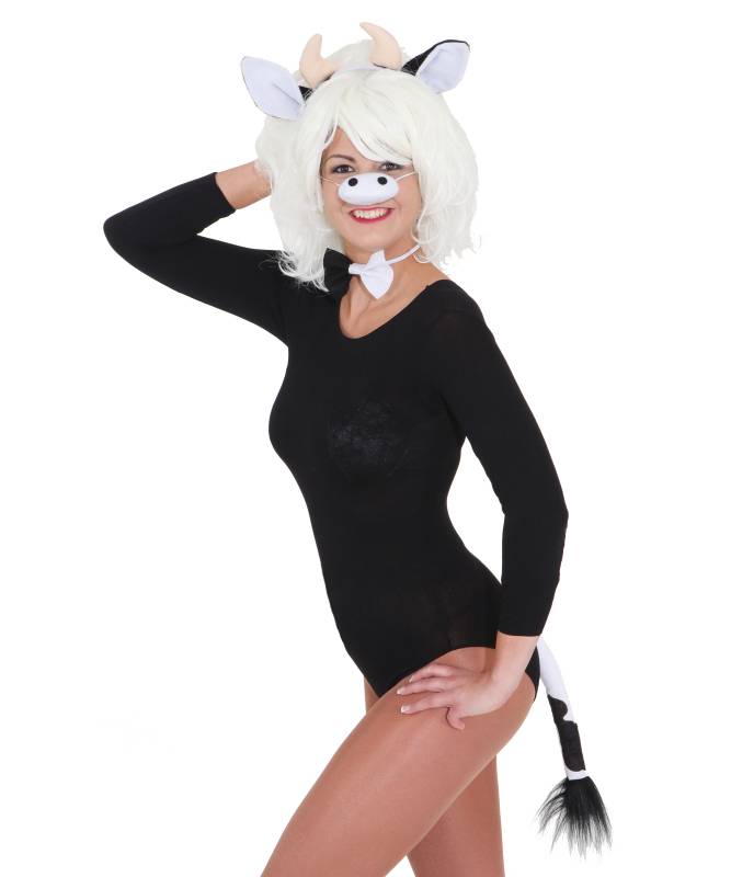 Kit de vache composé d'un serre-tête avec oreilles, d'un museau, d'un nÅud papillon et d'une queue de vache.Voilà un set noir et blanc pour se déguiser simplement en ruminant des prés!Taille : Ado-Adulte.