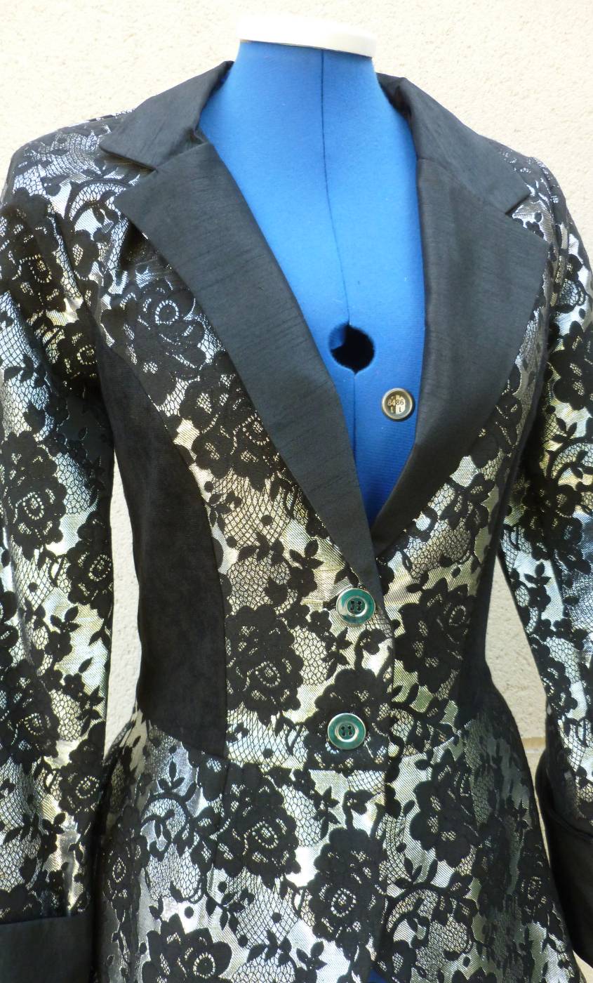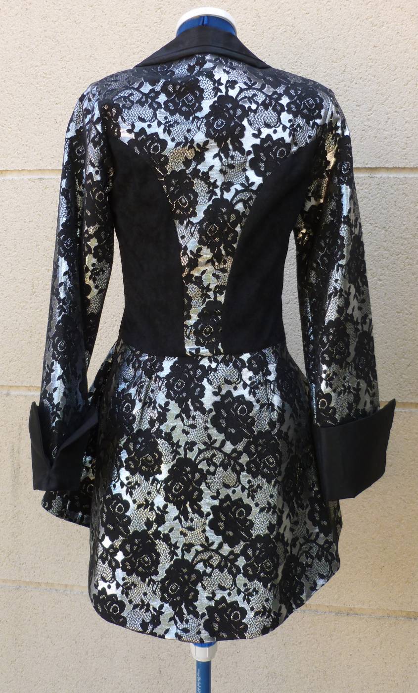 Veste pour femme en tissu brocart argent et noir, boutonnée. Tissu : 100% polyester.Deux larges bandes de velours noirs sur les côtés contrastent agréablement avec le brocart argent. Accompagnée d'un haut de forme, d'une culotte cabaret ou d'un collant cette veste est idéale pour tout spectacle de scène.Cette veste Brocart est sublime.