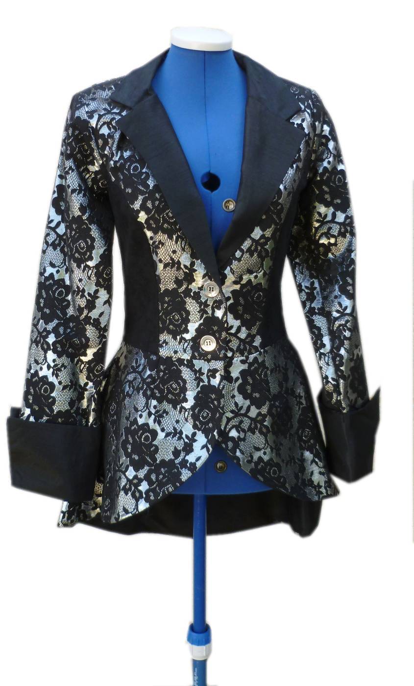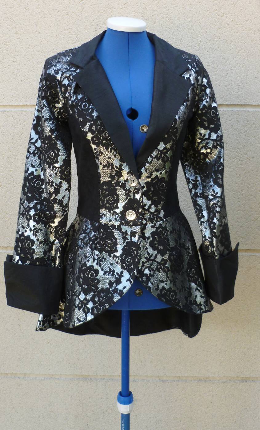 Veste pour femme en brocart argent et noir en grande taille.Cette magnifique veste boutonnée est idéale pour tout spectacle cabaret ou pour incarner une marquise.Tissu : 100% polyester, deux larges bandes de velours noirs sur les côtés contrastent agréablement avec le brocart argent.